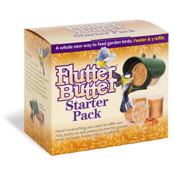 Get started feeding Flutter Butter in your garden with this fabulous complete starter pack, including an easy to use hanging feeder, empty Flutter Butter pod, plus three original peanut butter eco refills.