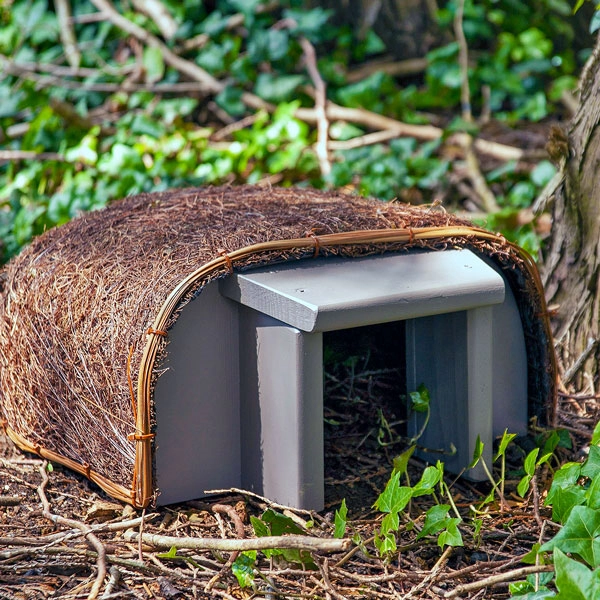 The house provides shelter and sanctuary from dangers in the garden. Underneath the textured brushwood finish, there is a sturdy steel frame covered with a waterproof felt lining. The wooden entrance door forms a short predator defence tunnel, small enough to deter access to dogs or badgers.